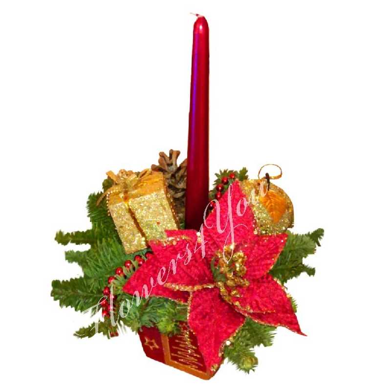 Aranjament craciun floare lumanare rosie glob auriu
