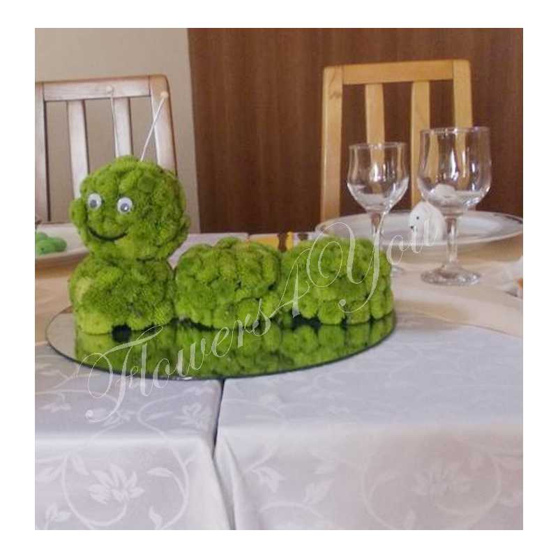 Aranjament floral vesel si dragalas de botez, realizat din santini verde pe suport in forma de omida jucausa.