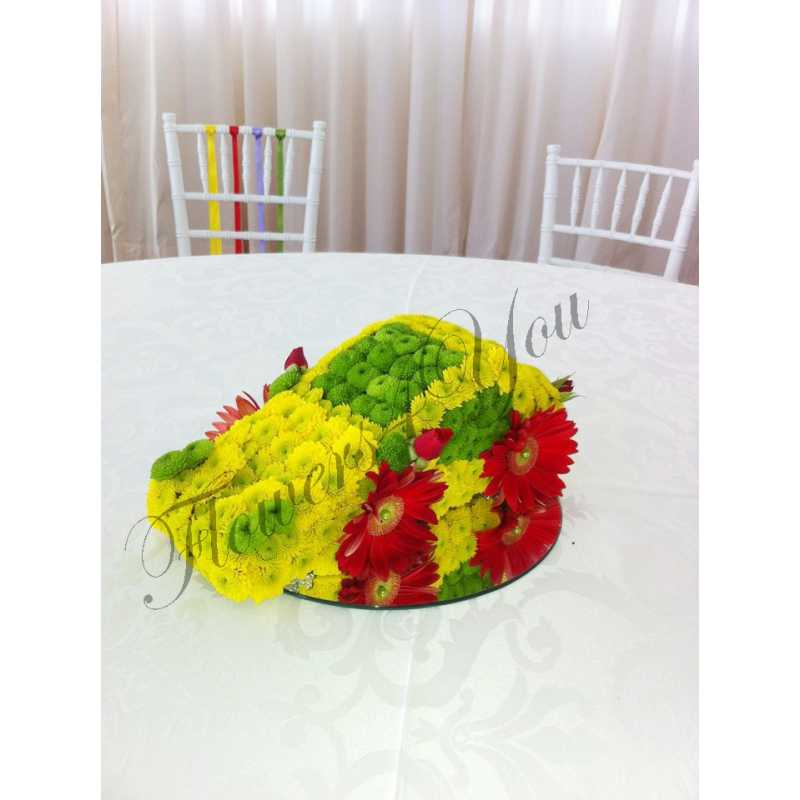 Aranjament floral de botez realizat din crizanteme si santini in nuante vesele de verde, galben si rosu.