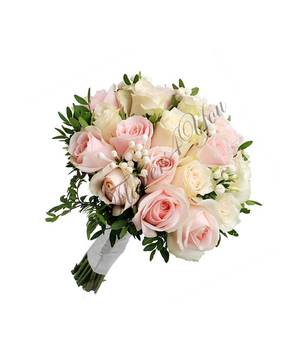 Buchete de mireasa din 15 trandafiri roz pal, 9 trandafiri albi, 5 buvardia.